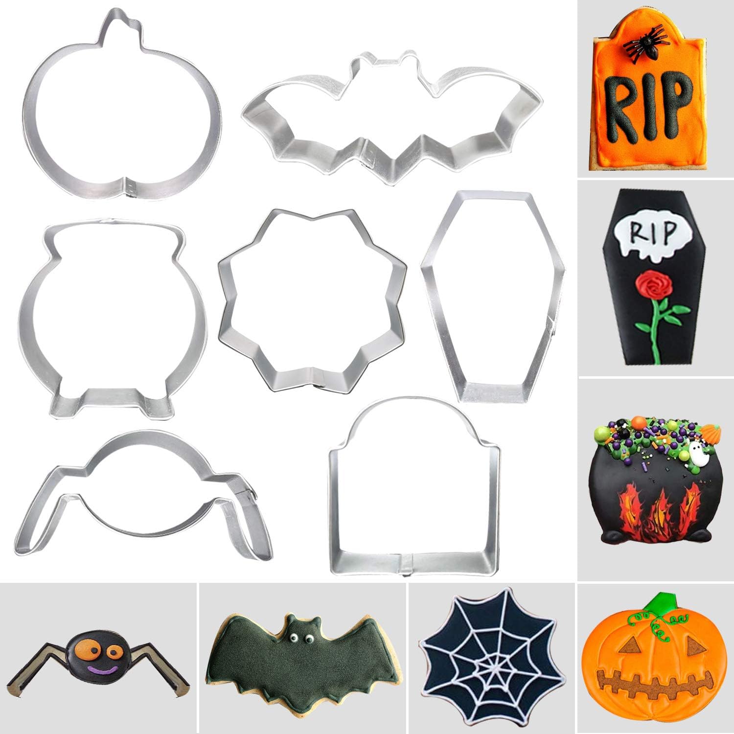 Amazon Com 7 Pcs Halloween Cookie Cutters Stainless Steel Biscuit Molds Set For Baking Cauldron Bat Pumpkin Web Coffin Tombstone Spider Party Decorations Kitchen Dining