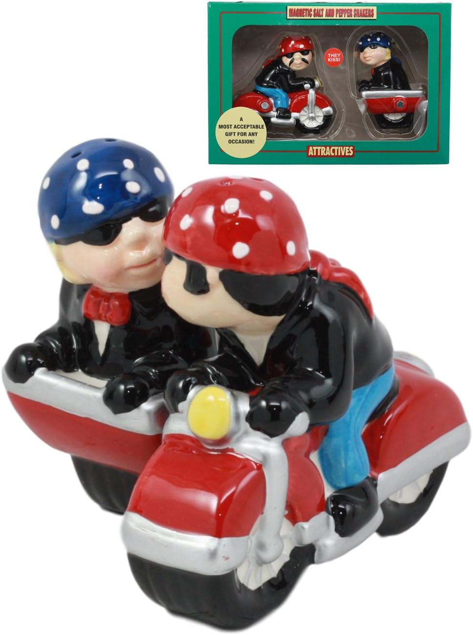 Amazon Com Ebros Patriotic Biker Couple Riding Motorcycle And Side Car Rig Salt And Pepper Shakers Set Magnetic Ceramic Figurines With Rubber Stoppers Kitchen Dining