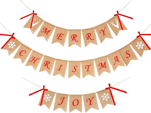 Amazon Com 3 Pieces Merry Christmas Banner Joy Banner Rustic Christmas Bunting Garland With Red Bow Ribbon For Christmas Fireplace Wall Tree Hanging Decorations Home Kitchen