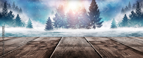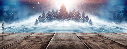 Winter Background Winter Snow Landscape With Wooden Table In Front Dark Winter Forest Background At Night Snow Fog Moonlight Dark Neon Night Background In The Forest With Moonlight Buy This Stock
