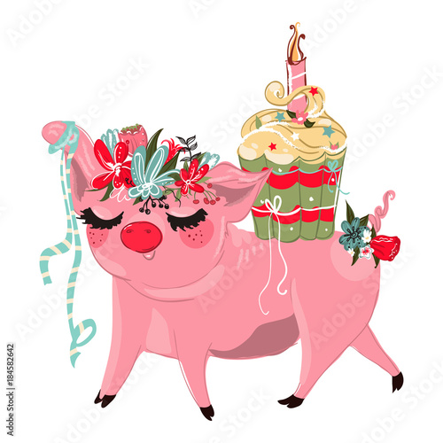 Hand Drawn Piggy Cute And Beautiful With Floral Flowers Wreath On The Head Ribbon And Delicious Cake With Decoration And Candle Happy Birthday Piglet Vector Watercolor Buy This Stock Vector And