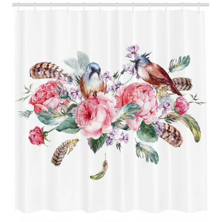 Flowers Shower Curtain Watercolor Style Effect Vintage Design With Roses Birds And Feathers Fabric Bathroom Set With Hooks 69w X 70l Inches Coral And Reseda Green By Ambesonne Walmart Com Walmart Com