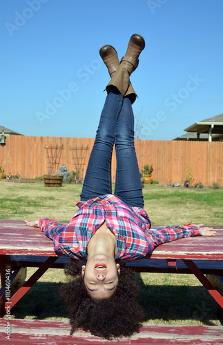 Upsidedown Legs Up Teenage Girl In Western Attire Laying Upside Down On A Picnic Table Buy This Stock Photo And Explore Similar Images At Adobe Stock Adobe Stock